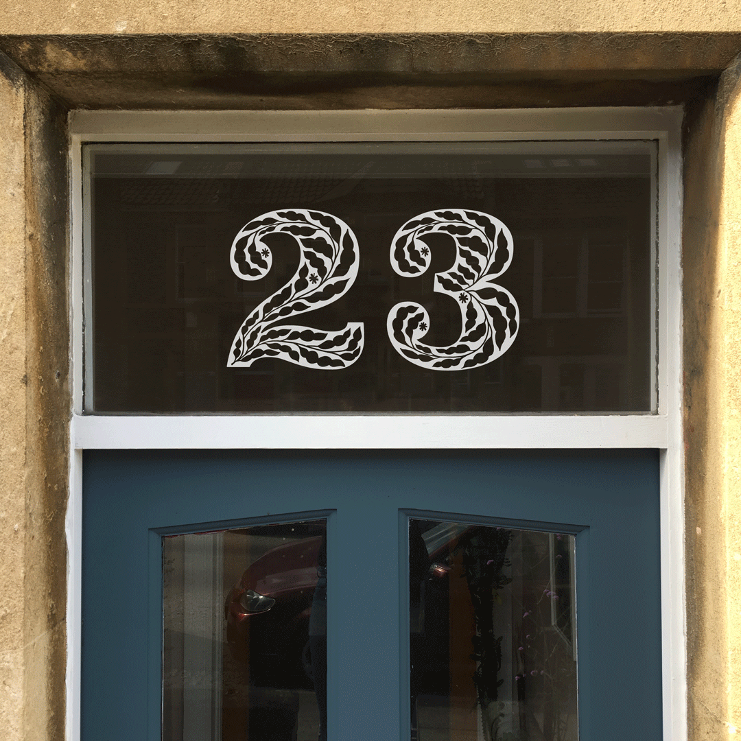 Our newest addition to the Blossom & Brush range. The individual Botanical door numbers adhere to your fanlight glass. Printed white on the highest quality window film.