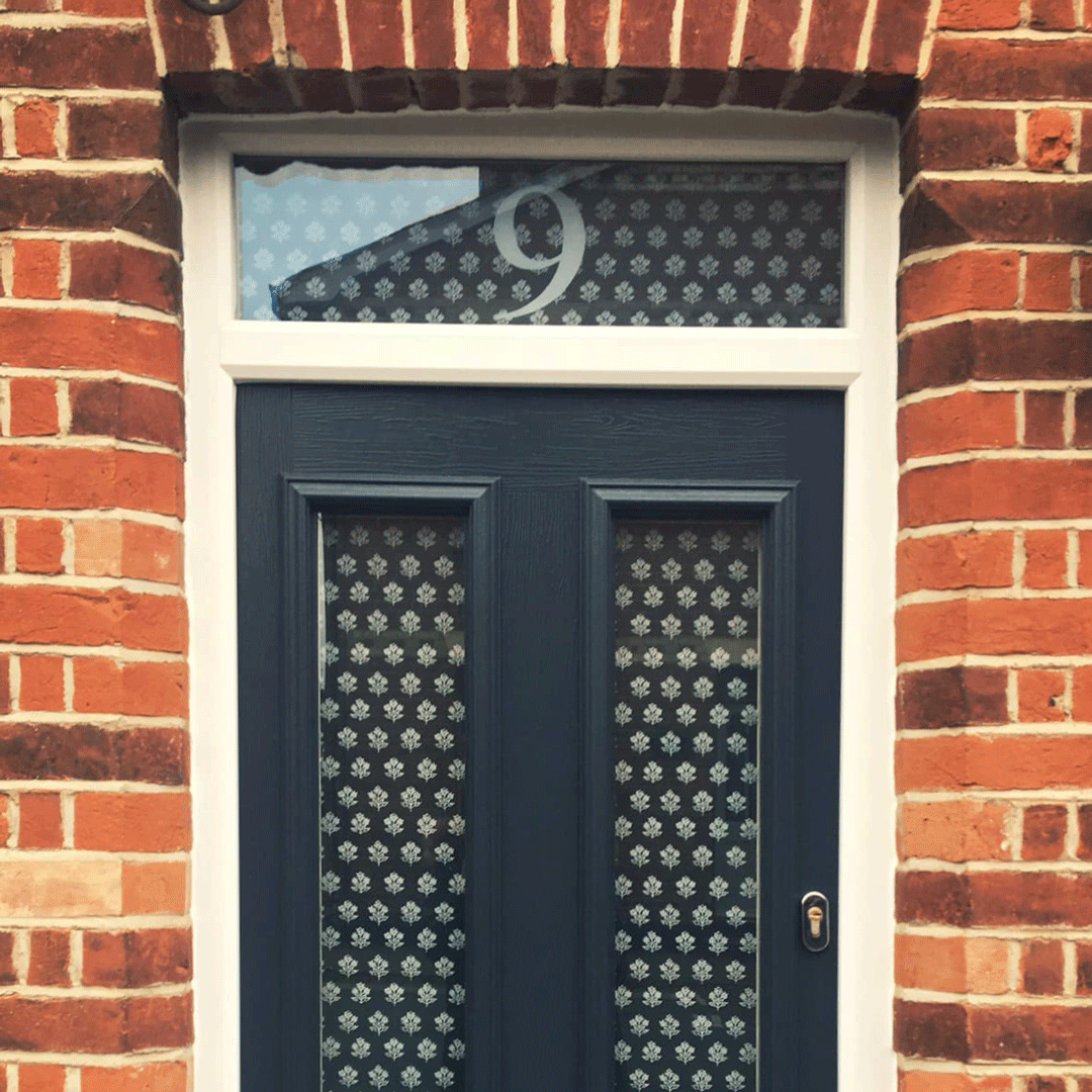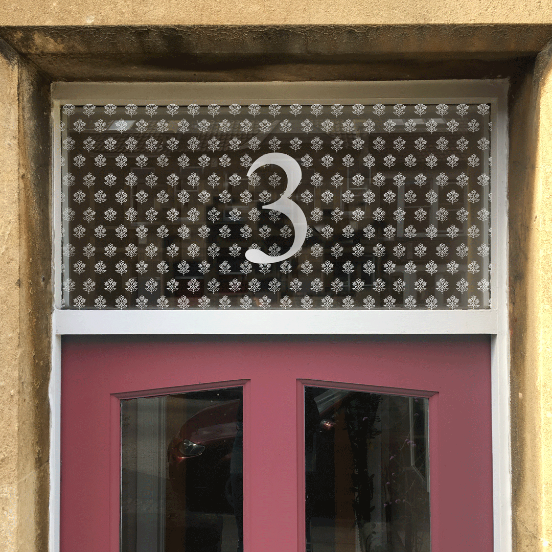 Made to measure custom door number window film combined with our Woodblock design to fit your fanlight window.